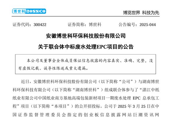 安徽博世科环保科技股份有限公司(简称:博世科)4月2日公告称,公司与湖南博世科环保科技有限公司成为“湛江中纸纸业有限公司中国纸业南方基地高端包装新材项目一期废水处理EPC总承包工程”项目的中标人,中标价1.17亿元。 湛江中纸一期废水处理工程包括建设7200m³/d的废水预处理和厌氧处理系统、100...