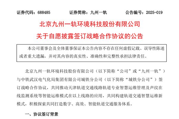 北京九州一轨环境科技股份有限公司(简称:九州一轨)4月1日公告称,公司与中铁武汉电气化局集团有限公司城铁分公司签订了战略合作协议,共同推动天津轨道交通线路轨道专业智慧运维管理及声纹在线监测系统等智能运维模式在以上线路的应用,共同构建轨道交通智慧运维新模式,积极探索共同打造数字、高效、智能轨道交通服务体系。 九州一轨认为,公司从需求端...