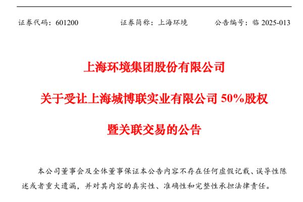 上海环境集团股份有限公司(简称:上海环境)4月3日公告称,公司拟以自有资金及自筹资金合计人民币58,243.06万元,采用非公开协议转让的方式受让上海城投资产管理(集团)有限公司持有的上海城博联实业有限公司(下称“城博联公司”)50%股权,待城博联公司名下在建的世博A片区A03D-02地块项目建成后,为其及下属...