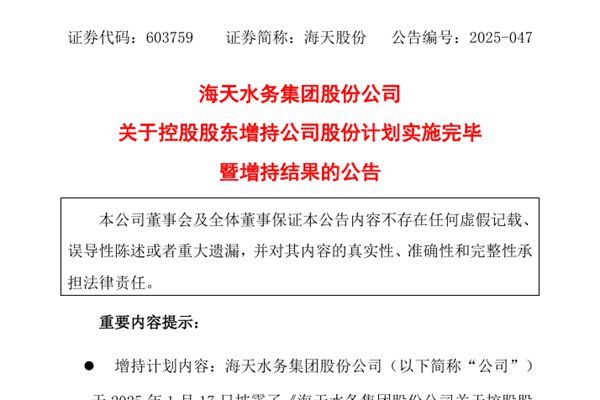 近日,海天水务集团股份公司(简称:海天股份)发布《关于控股股东增持公司股份计划实施完毕暨增持结果的公告》。公告显示,海天股份控股股东四川海天投资有限责任公司(下称“海天投资”)自本公告披露之日起 12 个月内通过上海证券交易所交易系统采用集中竞价方式增持公司A股股份,增持总金额不低于人民币1亿元,不高于人民币1...