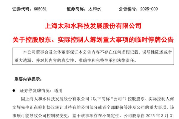 3月31日,上海太和水科技发展股份有限公司(简称:太和水)发布《关于控股股东、实际控制人筹划重大事项的临时停牌公告》。公告显示,太和水控股股东、实际控制人何文辉先生正在筹划协议转让其持有的公司部分或者全部股份等涉及公司的重大事项,该事项可能导致公司控制权变更,鉴于该事项存在不确定性,公司股票自2025年3月31日起停牌。 相关证券停...