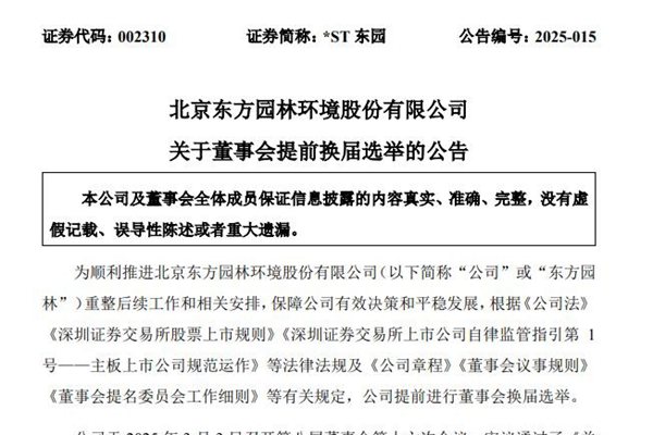 北京东方园林环境股份有限公司(简称:*ST东园,下称“东方园林”)近日公告称,为顺利推进公司重整后续工作和相关安排,保障公司有效决策和平稳发展,决定提前进行董事会换届选举。 根据《公司章程》的规定,公司第九届董事会拟由 9 名董事组成,其中非独立董事 6 名,独立董事 3 名。 一、第九届董事会非独立董事候...