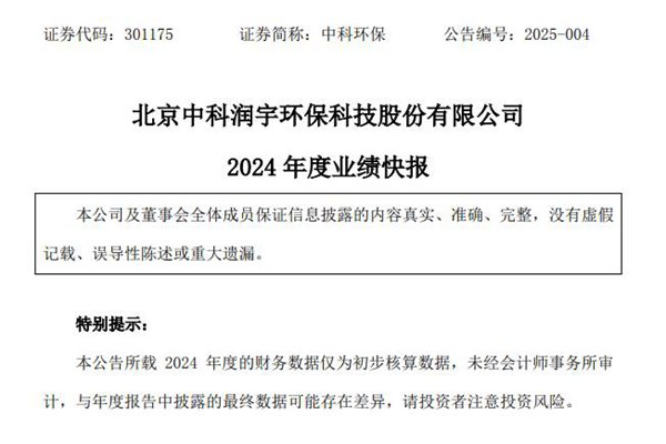 2月26日,北京中科润宇环保科技股份有限公司(简称:中科环保)发布《2024 年度业绩快报》。快报显示,中科环保2024年实现营业总收入16.63亿元,同比增长18.43%;净利润3.21亿元,同比增长18.92%;基本每股收益0.22元。 中科环保表示,2024 年公司积极拓展垃圾量及供热市场,新并购项目及已投产项目产能进一步释放...
