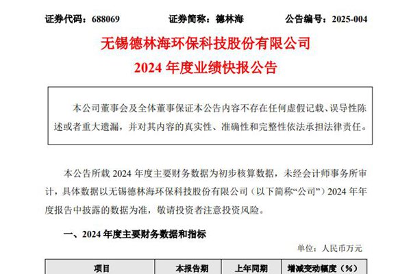 2月27日,无锡德林海环保科技股份有限公司(简称:德林海)发布《2024 年度业绩快报公告》。快报显示,德林海2024年实现营业总收入4.48亿元,同比上涨44.50%;归属于母公司股东的净利润-8123.79万元,较去年同期亏损扩大6779.68万元;基本每股收益为-0.73元;归属于母公司股东的每股净资产为11.01元。 德林海...