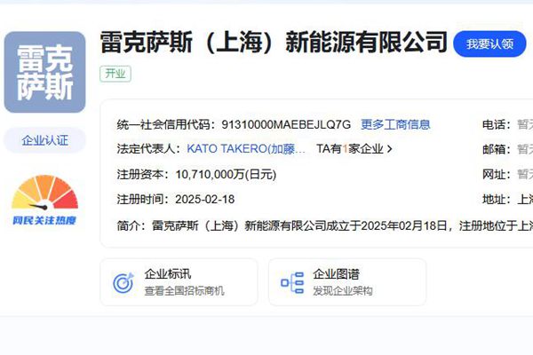 2月18日,雷克萨斯(上海)新能源有限公司注册成立,法定代表人为KATO TAKERO,注册资本1071亿日元(约51.75亿元人民币),经营范围: 【一般项目】技术服务、技术开发、技术咨询、技术交流、技术转让、技术推广;汽车零部件研发;软件开发;机械设备研发;电机及其控制系统研发;汽车销售;新能源汽车整车销售;汽车零配件批发;汽车...