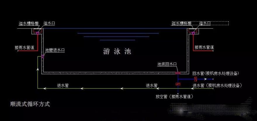 顺流式采用泳池两侧池壁进水,池底深端回水的循环方式,具体做法是:在两侧每条泳道线正下方池壁的正中央设置进水口,在池底最深端设置若干回水口,进水口的数量是泳道线数量的2倍,回水口数量等于泳道线的数量。顺流式实际上是模拟自然界河流的运动方式,实现处理过的水推动着使用过的水(即新水推旧水)进入水处理设备,从而避免了新水与旧水的混合。采用顺...