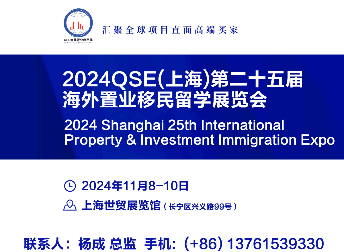 2024QSE上海第二十五届海外置业移民留学展览会a海外房产 | 投资移民 | 出国留学2024年11月8-10日 上海世贸展馆 展会概况上海海外置业及投资移民展,是目前中国针对日益发展的海外置业及投资移民行业的盛会,展会涵盖四大主题:海外置业、海外移民、海外投资、海外留学。为期两天的展会将会有来自欧洲、北美洲、亚洲、澳洲、非洲等 30多...
