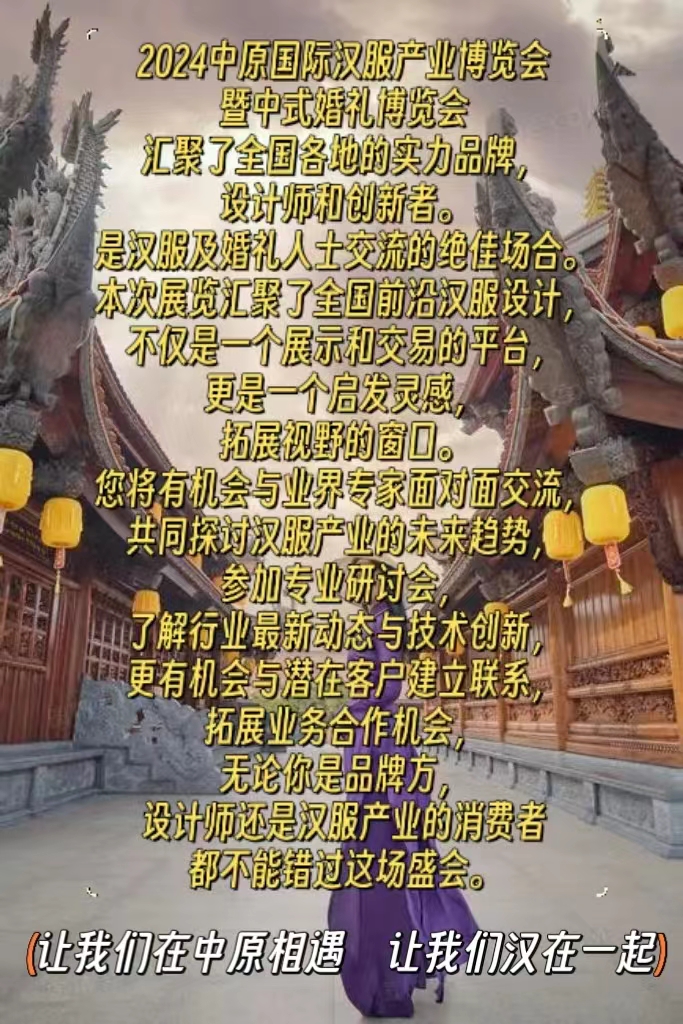2024年9月我们相约中原 2024中原国际汉服产业暨中式婚礼博览会 2024 ZhongyuanInternationalHanfuIndustryandChineseWeddingExpo 时间:2024年9月23-25日展览地点:郑州中原国际博览中心 邀请函 拟邀单位:中国传统文化促进会/汉服专委会河南省服装行业协会汉服专委会...