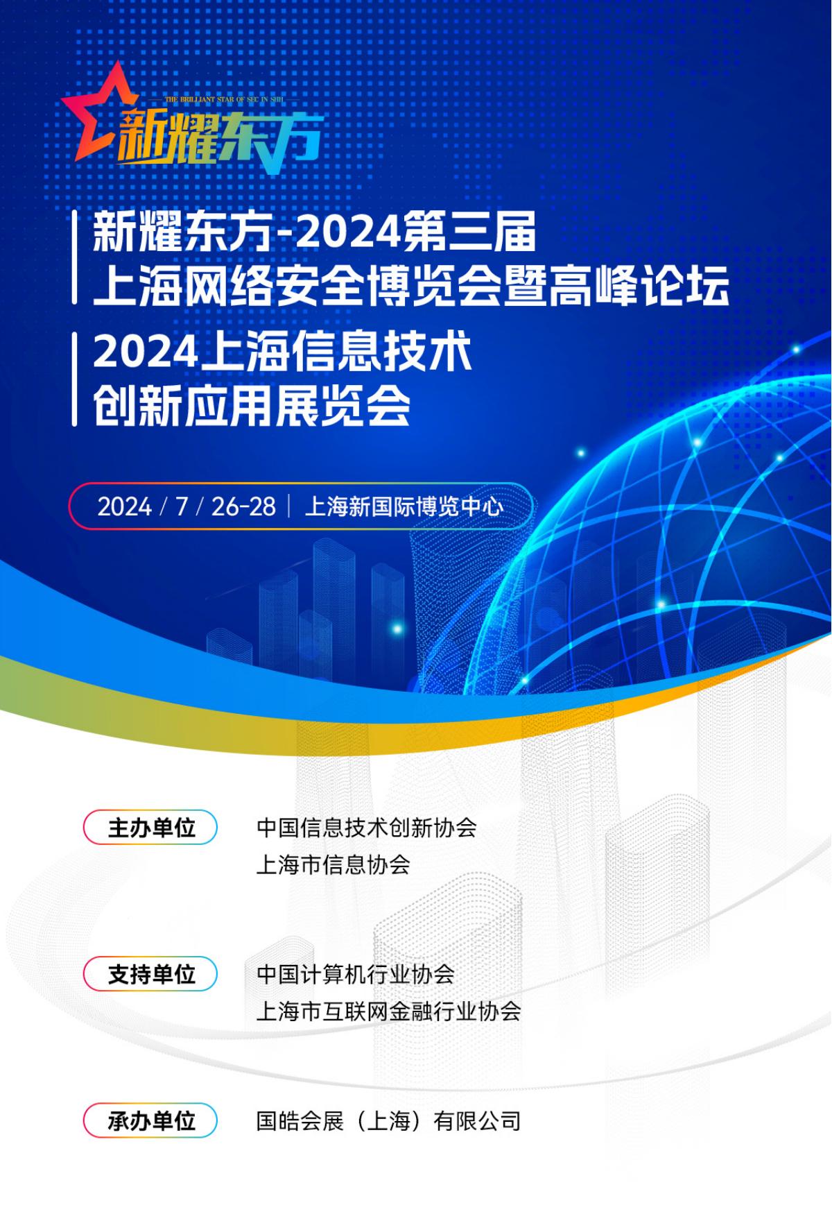 新耀东方-2024第三届上海网络安全博览会暨高峰论坛 2024上海信息技术创新应用展览会 2024 /7/26-28 |上海新国际博览中心 主办单位 中国信息技术创新协会 上海市信息协会 支持单位 中国计算机行业协会 上海市互联网金融行业协会 承办单位 国皓会展(上海)有限公司 展会背景 信息技术创新应用产业是目前国内的一项战略,也...