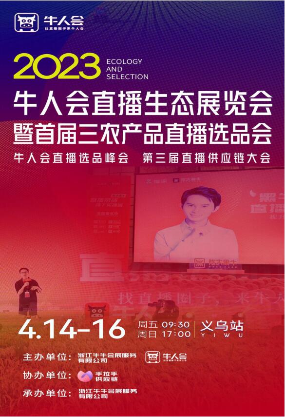 2023牛人会直播生态(义乌)展览会 同期举办:牛人会直播选品峰会 第三届直播供应链大会 时间:2023年4月14-16日 地点:义乌国际博览中心 主办单位:牛人会 浙江牛牛会展服务有限公司 协办单位:浙江手拉手供应链管理有限公司 承办单位:浙江牛牛会展服务有限公司 展会前言: 目前我国直播电商市场处于高增状态,直播带货成为新零售趋...