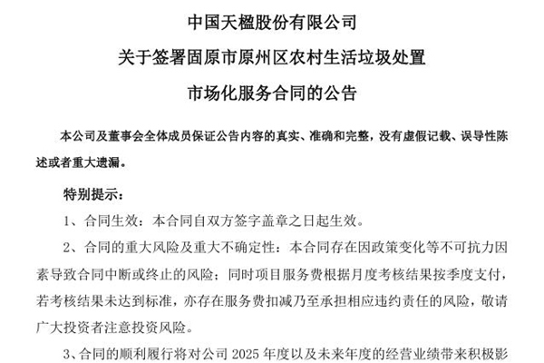2025年01月16日,中国天楹股份有限公司发布《关于签署固原市原州区农村生活垃圾处置市场化服务合同的公告》。图源:中国天楹公告 公告显示,近日,采购人固原市原州区住房城乡建设和交通局与中国天楹股份有限公司签订了《农村生活垃圾处置市场化服务合同》,根据合同约定,公司为原州区范围内11个乡镇提供镇区道路等清扫、生活垃圾收(转)运以及...