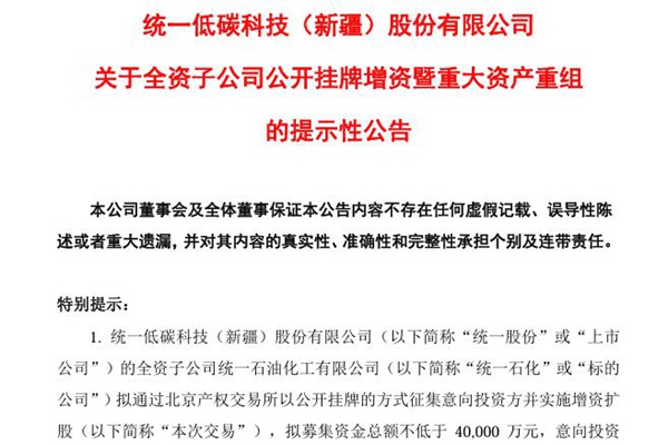 2025年01月16日,统一低碳科技(新疆)股份有限公司发布《关于全资子公司公开挂牌增资暨重大资产重组的提示性公告》。图源:统一股份公告 公告显示,统一股份的全资子公司统一石油化工有限公司拟通过北京产权交易所以公开挂牌的方式征集意向投资方并实施增资扩股,拟募集资金总额不低于 40,000 万元,意向投资方持有统一石化的股权比例不超过...