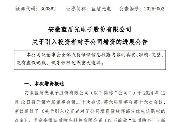安徽蓝盾光电子股份有限公司(简称:蓝盾光电)公告称,近日,子公司安徽蓝盾防务科技有限公司(下称“蓝盾防务”)完成了增资相关的工商变更登记,并取得了铜陵市铜官区市场监督管理局颁发的营业执照。本次工商变更登记完成后,蓝盾防务成为蓝盾光电的参股公司,不再纳入公司合并报表范围。 据悉,2024年12月12日,蓝盾光电...