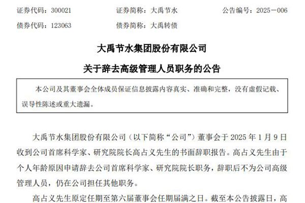 大禹节水集团股份有限公司(简称:大禹节水)近日公告称,公司董事会于2025年1月9日收到首席科学家、研究院院长高占义先生的书面辞职报告。高占义先生由于个人年龄原因申请辞去公司首席科学家、研究院院长职务,辞职后不为公司高级管理人员,仍在公司担任其他职务。 高占义先生原定任期至第六届董事会任期届满之日。截至本公告披露日,高占义先生持有公...
