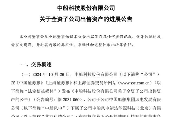 2024年12月31日,中船科技股份有限公司发布《关于全资子公司出售资产的进展公告》。图源:中船科技公告 公告显示,公司子公司收到产权交易所相关通知,挂牌标的均已征集到受让方。 甘肃申禾新能源有限公司、电投新锐建新(北京)智慧能源股权投资基金合伙企业(有限合伙)作为联合体,成为张掖新能源100%股权和高台新能源公司100%股权的受...