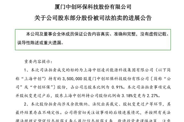 2025年01月03日,厦门中创环保科技股份有限公司发布《关于公司股东部分股份被司法拍卖的进展公告》。图源:中创环保公告 公告显示,中创环保股东上海中创持有的公司3,500,000股股票(占公司总股本的0.91%)在京东网人民法院司法拍卖平台上进行公开拍卖,经查询京东网人民法院司法拍卖平台,成交金额为42,118,300.00元,买...