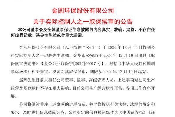 2024年12月12日,金圆环保股份有限公司发布关于实际控制人之一取保候审的公告。图源:金圆股份公告 公告称,该事项对公司生产经营及规范运作不存在重大影响。 金圆股份,前身为光华股份,上市时是一家建材公司,主营水泥及混凝土产品,房地产业务占据重大比例。自2014年重大重组后,金圆股份更名,并开始向建材行业进发,3年后通过12亿的非...