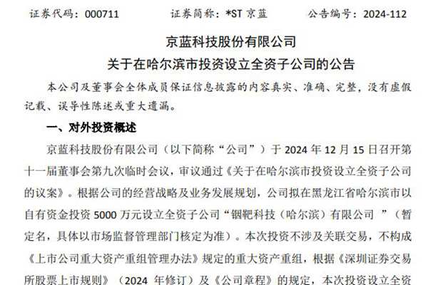 京蓝科技股份有限公司(简称:*ST京蓝,下称“京蓝科技”)近日公告称,公司拟以自有资金投资 5000 万元在哈尔滨市投资设立全资子公司,暂定名“铟靶科技(哈尔滨)有限公司”,经营范围包括:电子专业材料研发;电子专用材料销售;金属材料销售;金属制品销售;资源再生利用技术研发;技术服务、技术...