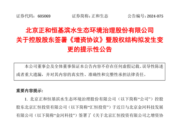2024年11月29日公告,北京正和恒基滨水生态环境治理股份有限公司(下称“正和生态”)控股股东北京汇恒投资有限公司于近日与北京金河科技发展有限公司签署了《关于北京汇恒投资有限公司之增资协议》,该增资协议于2024年11月28日正式生效。 据悉,金河科技以货币出资方式认缴本次新增注册资本人民币17,164,5...
