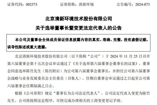 北京清新环境技术股份有限公司(简称:清新环境)公告称,公司第六届董事会第十五次会议审议通过了《关于选举第六届董事会董事长的议案》,董事会同意选举陈竹先生为公司第六届董事会董事长,并担任公司第六届董事会战略与业务发展委员会主任委员(召集人),任期自董事会审议通过之日起至公司第六届董事会任期届满之日止。 根据《公司章程》规定&ldquo...