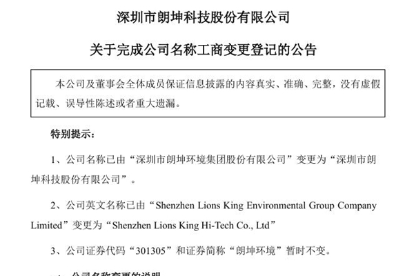 2024年11月21日,深圳市朗坤科技股份有限公司发布《关于完成公司名称工商变更登记的公告》。 近日,朗坤环境已经完成工商变更登记备案手续,并取得了由深圳市市场监督管理局换发的《营业执照》。 1、公司名称已由“深圳市朗坤环境集团股份有限公司”变更为“深圳市朗坤科技股份有限公司”。 ...