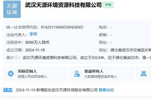近日,武汉天源环境资源科技有限公司正式成立,注册资本8000万元,由武汉天源环境资源科技有限公司持股100%,所属行业为生态保护和环境治理业。经营范围包括: 【一般项目】发电技术服务;固体废物治理;再生资源回收(除生产性废旧金属);再生资源销售;再生资源加工;资源再生利用技术研发;资源循环利用服务技术咨询;新能源汽车废旧动力蓄电池回...