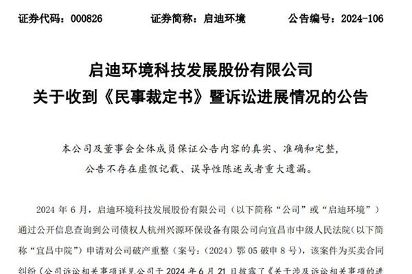 近日,启迪环境科技发展股份有限公司(简称:启迪环境)发布公告称,其债权人杭州兴源环保设备有限公司申请对公司进行破产重整。然而,综合杭州兴源公司提交的证据及启迪公司提交的证据,本案不足以认定启迪环境作为债务人,其资产不足以清偿全部债务或明显缺乏清偿能力,对杭州兴源公司的破产清算申请,宜昌市中级人民法院裁定不予受理破产清算申请。 启迪环...