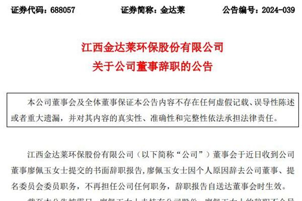江西金达莱环保股份有限公司(简称:金达莱)近日发布《关于公司董事辞职的公告》。公告显示,金达莱董事会于近日收到公司董事廖佩玉女士提交的书面辞职报告,廖佩玉女士因个人原因辞去公司董事、提名委员会委员职务,不再担任公司任何职务,辞职报告自送达董事会时生效。 据悉,金达莱是一家专业从事水环境治理的高科技环保企业,也是江西省首家科创板上市环...