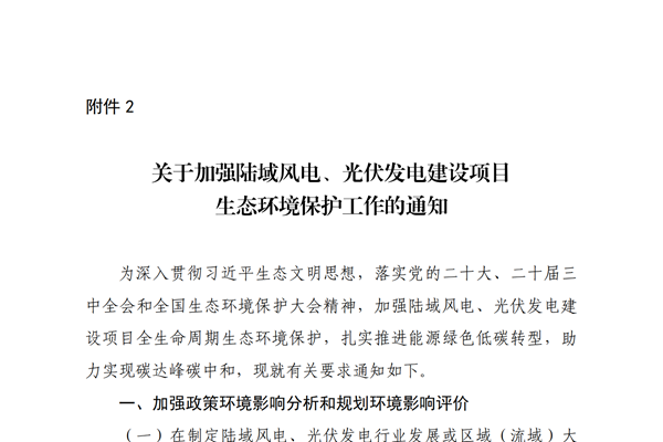 关于公开征求《关于加强陆域风电、光伏发电建设项目生态环境保护工作的通知(征求意见稿)》意见的函 为深入贯彻习近平生态文明思想,落实党的二十大、二十届三中全会和全国生态环境保护大会精神,加强陆域风电、光伏发电建设项目全生命周期生态环境保护,我部组织起草了《关于加强陆域风电、光伏发电建设项目生态环境保护工作的通知(征求意见稿)》,现公开征求...