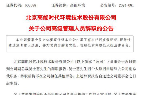 北京高能时代环境技术股份有限公司(简称:高能环境)公告称,董事会于近日收到公司副总裁吴士慧先生的辞职报告,吴士慧先生因个人原因申请辞去公司副总裁职务,辞职后将不在公司担任其他职务。 据悉,高能环境主营业务主要分为固废危废资源化利用、环保运营服务及环保工程三大板块。2024年上半年,高能环境实现营业收入 75.45 亿元,比上年同期增...