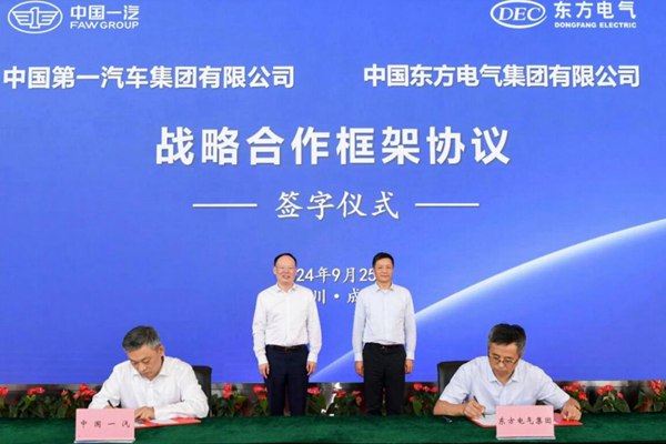 9月25日,中国东方电气集团有限公司与中国第一汽车集团有限公司在蓉签署战略合作框架协议。在东方电气集团党组书记、董事长俞培根,中国一汽集团党委书记、董事长邱现东的共同见证下,东方电气集团党组成员、副总经理孙国君,中国一汽集团党委常委、副总经理吴碧磊代表双方签字。 本次签署协议,标志着双方将在氢能产品市场推广、股权投资、产业链延伸、国...