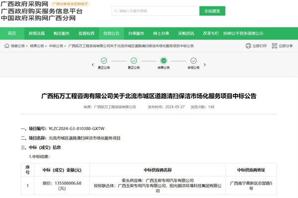 广西政府采购网消息,9月27日,玉柴集团旗下广西玉柴专用汽车有限公司收获环卫服务首标,成交金额高达1.36亿元,成交情况如下: 项目名称:北流市城区道路清扫保洁市场化服务项目 中标供应商名称:广西玉柴专用汽车有限公司(联合体) 牵头供应商:广西玉柴专用汽车有限公司 投标联合体:广西玉柴专用汽车有限公司、阳光朗洁环境科技集团有限...