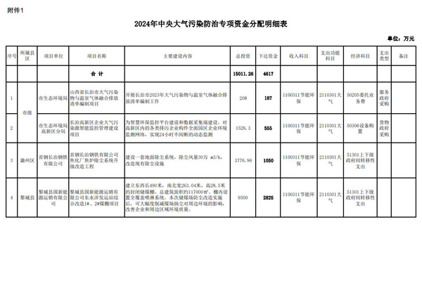 长治市财政局、长治市生态环境局联合发布《关于下达2024年中央大气污染防治专项资金的通知》。 山西省长治市大气污染物与温室气体融合排放清单编制项目,长治高新区企业大气污染源智能监控管理建设项目、首钢长治钢铁有限公司焦化厂焦炉除尘系统升级改造工程、黎城县国新能源运销有限公司东水洋发运站综合改造1#、2#煤棚项目,合计总投资15011....