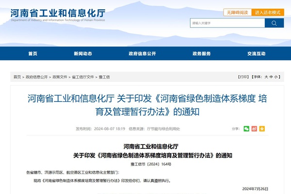 河南省工业和信息化厅关于印发《河南省绿色制造体系梯度培育及管理暂行办法》的通知 豫工信节〔2024〕164号 各省辖市、济源示范区、航空港区工业和信息化主管部门: 现将《河南省绿色制造体系梯度培育及管理暂行办法》印发给你们,请认真遵照执行。 2024年7月26日河南省绿色制造体系梯度培育及管理暂行办法 第一条 为进一步完善河南省...
