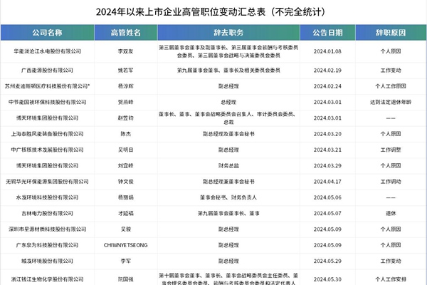 2024年至今,各大上市企业已经公开了数十项人事变动,涉及的职位包括董事、副总、总裁、总经理、委员、董秘、财务总监、CEO等等,甚至同一家环保企业已经公布了多个高管人员变动。如中广核技、博天环境、城发环境、大唐等等。 其中,广西能源股份有限公司、博天环境集团股份有限公司、浙江钱江生物化学股份有限公司、湖北能源集团股份有限公司、扬州洁...