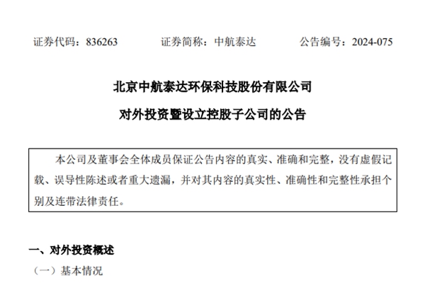 北京中航泰达环保科技股份有限公司(下称“中航泰达”)今日公告称,基于业务发展需求,投资人民币 350.00 万元,持股比例 70%,设立河南控股子公司河南郑石科技有限公司。本次交易不构成重大资产重组,不构成关联交易。 关于河南郑石科技有限公司 注册地址:河南省郑州市管城回族区中州大道东、航海路北 15 幢 ...