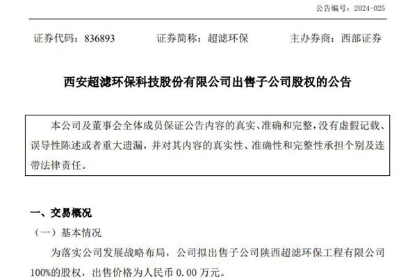 近日,西安超滤环保科技股份有限公司(简称“超滤环保”)发布公告称,公司拟出售子公司陕西超滤环保工程有限公司(下称“陕西超滤”)100%的股权,出售价格为人民币0.00万元。 公告显示,陕西超滤成立于2019年,注册资本1000万元,主营业务涉及水污染治理;信息技术咨询服务;专用设备修理...