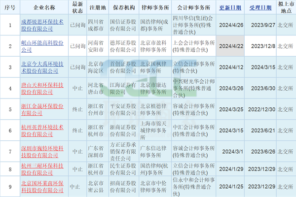 近期,环境商会观察到,有三家环境企业打算冲击北交所。另外,根据商会不完全统计,2024年北交所排队的有9家环境企业,其中,锐思环保、岷山环能、今大禹环境更新了状态为已问询,天和环保、 巍特环境、三耐环保、国环莱茵环保目前是中止状态,金晟环保、英普环境终止IPO。已成功上市企业4家。 3家拟北交所IPO的环境企业如下: 中环洁集团股...