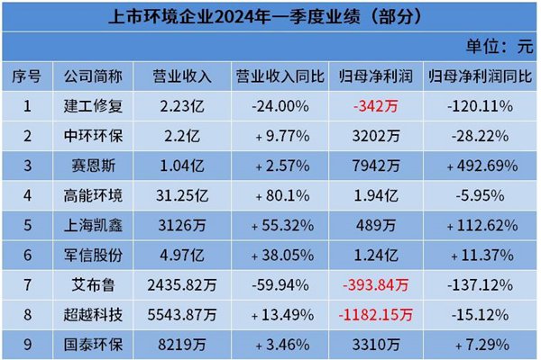 据环保在线不完全整理,截至目前,已有73家环境上市公司公布2024年一季度报告。其中,实现营业收入、归母净利润同比双增长的仅25家,占比约34%。另,还有20家公司净利润出现亏损,包括建工修复、新安洁、节能铁汉、启迪环境、巴安水务等。详见下表↓↓(如有错漏,欢迎在评论区指正及补充) 营业收入超过10亿元的共14家...