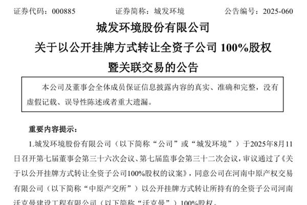 城发环境股份有限公司(简称:城发环境)近日公告称,2025年9月15日至2025年10月17日,公司在河南中原产权交易有限公司(下称“中原产交所”)公开挂牌转让全资子公司河南沃克曼建设工程有限公司(下称“沃克曼”)100%股权,挂牌底价以经有权国资监管部门备案后的资产评估结果确定为11,...