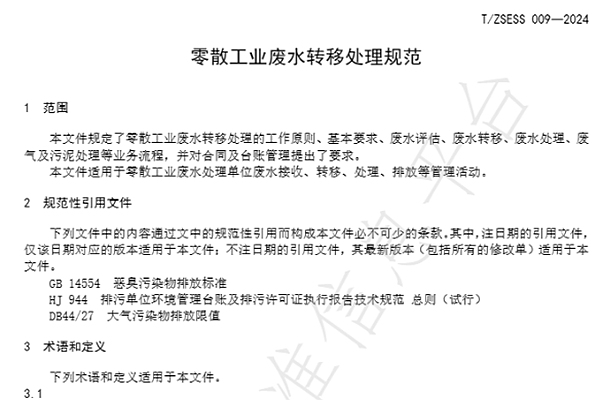 2024年2月22日发布,5月1日即将施行的《零散工业废水转移处理规范》(T/ZSESS 009—2024)经由中山市环境科学学会发布。 该标准规定了零散工业废水转移处理的工作原则、基本要求、废水评估、废水转移、废水处理、废气及污泥处理等业务流程,并对合同及台账管理提出了要求。 本文件适用于零散工业废水处理单位废水接收、...