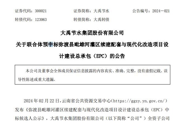 大禹节水集团股份有限公司(简称:大禹节水)发布“关于联合体预中标弥渡县毗雄河灌区续建配套与现代化改造项目设计建设总承包(EPC)的公告”,预计中标金额8580万元。 大禹节水表示,本次预中标本项目是公司坚定落实国家乡村振兴和粮食安全战略、推行“三农三水三张网”战略理念的重要成果,也是公...