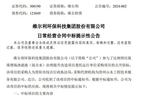 1月12日,维尔利环保科技集团股份有限公司(简称:维尔利)发布“日常经营合同中标提示性公告”,内容为比例坝垃圾填埋场渗滤液(混合水)治理提升改造项目委托运行单位采购项目。据悉,该项目成交金额为90.96元/立方米。根据该项目的运营期限、处理水量、中标价格相关要素估算,该项目总金额预计约为16645.68万元。 ...