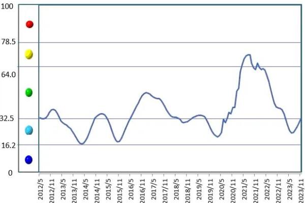 中国铝冶炼产业月度景气指数报告2023年11月中国有色金属工业协会 2023年11月份,中国铝冶炼产业景气指数为32.7,较上月上升2.6个点,处于“正常”区间下部;先行合成指数为57.5,较上月持平。近13个月中国铝冶炼产业景气指数见下表。 近13个月中国铝冶炼产业景气指数 景气指数处于正常区间内并较上月...