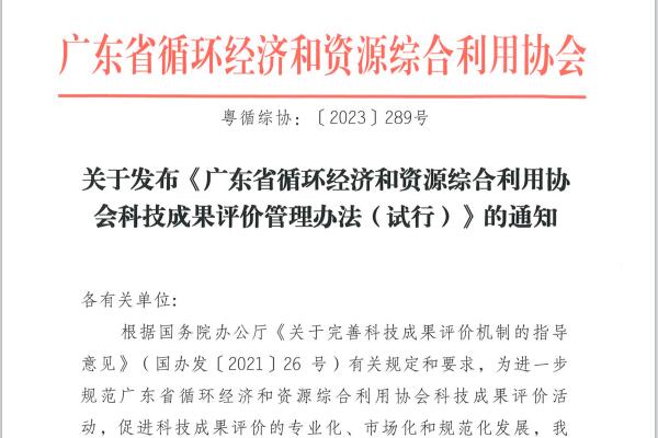 关于发布《广东省循环经济和资源综合利用协会科技成果评价管理办法(试行)》的通知 各有关单位: 根据国务院办公厅《关于完善科技成果评价机制的指导意见》(国办发〔2021〕26 号)有关规定和要求,为进一步规范广东省循环经济和资源综合利用协会科技成果评价活动,促进科技成果评价的专业化、市场化和规范化发展,我协会制定了《广东省循环经济和资源...