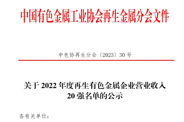 近日,中国有色金属工业协会再生金属分会发布《关于2022年度再生有色金属企业营业收入20强名单的公示》,浙江天能资源循环科技有限公司、宁波金田投资控股有限公司、浙江富冶集团有限公司等上榜。详情如下:...