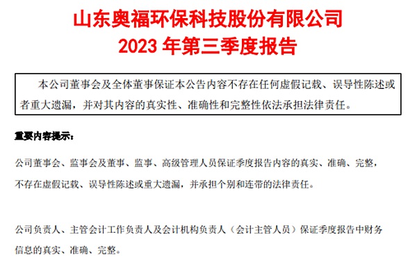 2023年10月21日,山东奥福环保科技股份有限公司发布2023年第三季度报告。报告显示,2023年第三季度公司营业收入5874.89万元,同比上涨68.6%,归属于上市公司股东的净利润-784.86万元。2023年1-9月,奥福环保总营收2.52亿元,同比上涨83.49%,归属于上市公司股东的净利润1082.75万元。 山东奥福环...