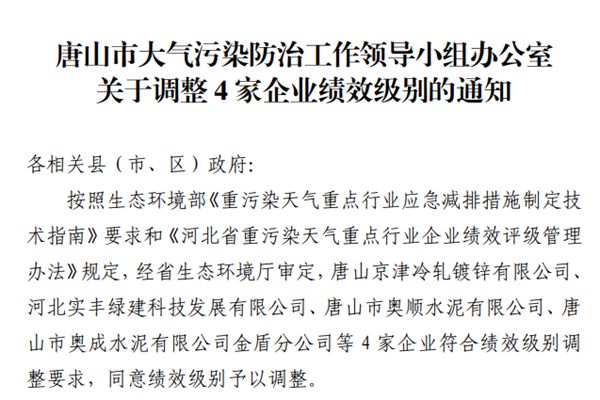 唐山市大气污染防治工作领导小组办公室发布关于调整4家企业绩效级别的通知,经省生态环境厅审定,唐山京津冷轧镀锌有限公司、河北实丰绿建科技发展有限公司、唐山市奥顺水泥有限公司、唐山市奥成水泥有限公司金盾分公司等4家企业符合绩效级别调整要求,同意绩效级别予以调整。并要求属地政府按照调整后的绩效等级,指导企业重新修订重污染天气应急减排措施和重...
