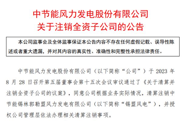 2023年8月30日,节能风电发布有关注销全资子公司的公告,明确公司于 2023 年8 月 28 日召开第五届董事会第十五次会议审议通过了《关于清算并注销全资子公司的议案》,同意公司根据业务实际情况,清算注销中节能锡林郭勒盟风力发电有限公司,并授权公司管理层依法办理相关清算注销事项。 拟注销全资子公司经营范围:风力发电项目的开发、投...
