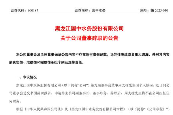黑龙江国中水务股份有限公司(简称:国中水务)公告称,公司第九届董事会董事周支柱先生因个人原因,近日向公司董事会递交书面辞职报告,申请辞去公司副董事长、董事职务。辞职后,周支柱先生将不在公司担任任何职务。 此次周支柱先生的辞职不会导致国中水务董事会成员低于法定最低人数,不会影响公司董事会的正常运行,亦不会对公司的规范运作和日常运营产生...